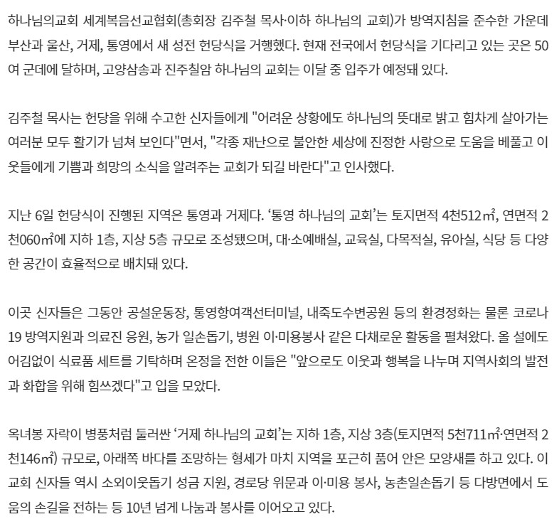 하나님의교회 세계복음선교협회(총회장 김주철 목사·이하 하나님의 교회)가 방역지침을 준수한 가운데 부산과 울산, 거제, 통영에서 새 성전 헌당식을 거행했다. 현재 전국에서 헌당식을 기다